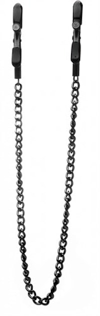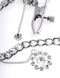 With this Chained collar and clamp set you can connect your playthings sensitive areas while adorened with seductive chain collar. The clamps feature vinyl-coated ends and will provide constant stimulation. Use your imagination. This devious set can be used on the male anatomy as well.
