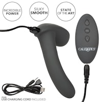 The Silicone Remote Pulsing Pleaser is the intimately curved teaser of your dreams. The sleek probe has a powerful pulsating tip, sensually curved design, and 12 functions of thumping made to thrill with every teasing touch. Choose the intensity of your pleasure and dive deep into orgasmic internal stimulation with powerful pulsating stimulation. The bulbous G-spot tip delivers deep thumping motions that redefine passion with or without the remote control from up to 32.75' (10m). Indulge personalized pleasure while the curved massager shakes to the rhythm of 12 functions of thumping. Control the variety of orgasmic options as the ribbed stimulator tickles sweet spots and sends you soaring into ecstasy. The high tech memory chip remembers just how you like it and resumes play on the last function used. Whether you're taking a dip with a lover or indulging in a steamy solo session, look forward to up to 1 hour of waterproof vibration. Recharge pleasure and get back to playtime in only 1.25 hours with the provided USB cable. The flexible vibe is made from a hygienically superior silicone. This body safe material is unscented and phthalate free to keep your most sensitive spots happy and healthy. 12 Functions of Intense Thumping Pulsations Easy to Use Push-Button Control with LED Light Hygienically Superior Silicone Compact and Discreet Remote Memory Chip Resumes on Last Function Used Stimulator May Be Used Independently of Remote Use Alone or with a Partner Instructions Included Waterproof Stimulator May Be Used In or Out of the Water One Year Warranty USB Rechargeable Stimulator and Remote, Dual Charging Cord Included Stimulator Will Run For: 50 Minutes on High Speed 70 Minutes on Low Speed Complete Charge in 1.25 Hours *Note, product will turn off after 30 minutes of inactivity 32.75' (10m) Remote Range Measurements: Probe: 3.5" x 1" / 9cm x 2.5cm Overall: 4.5" x 3.25" / 11.5cm x 8.25cm
