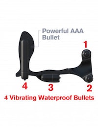 We’ve put a new twist on our best-selling anal cock ring that will have both partners buzzing! Get ready to experience the Ultimate Ass-Gasm, the first and only deluxe four-vibrator cock ring and prostate plug designed for couples! With a whopping four waterproof vibrating bullets powering the pleasure and providing explosive results, you’ll never look at ordinary cock rings the same way again! We dare you to try to find a single device on the market that combines so many of your favorite sensations into one awesome enhancement ring! Made from our silky-smooth Elite Silicone, this quadruple-action cock ring doubles as a wearable P-Spot plug, allowing you to prolong ejaculation and extend the session while enjoying an incredible prostate and taint massage. The smooth silicone ring fits snug like a glove and pushes your package out to the max, making you harder, stronger, and always ready for action. The tight squeeze puts a clamp on performance letdowns while the four vibrating bullets simultaneously stimulate your most sensitive zones! What really makes this ring so special is the strategic placement of four vibrating bullets! One bullet sits on the top ring for direct clitoral stimulation, one sits in front of your boys for an incredible ball buzz, one sits inside the ribbed perineum stimulator for a tantalizing taint massage, and one sits inside the prostate plug for wall-banging backdoor bliss! With all four bullets buzzing away, sex will never be the same again! The plug’s round, smooth tip makes entry and retrieval a snap, while the tapered shaft ensures the plug will stay in place between your cheeks when the action heats up. Every movement of the cock ring will shift the plug around inside your ass while the vibrating stimulator gives your taint a pulsating massage. The ring can be worn all day under your clothes and no one will know your little secret! The phthalate-free, latex-free Elite Silicone can be enjoyed in full confidence with water-based lubricants. Cleanup is a snap after the fun with toy cleaner and warm water. Use plenty of Moist for an extra wet and wild encounter!