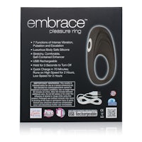 Our embrace pleasure rings feature 7 functions of intense vibration, pulsation, and escalation. The enhancer is crafted with luxurious and body-safe silicone with decor made of ABS with silver plating. These rings are as safe as they are exciting. The stretchy and comfortable enhancer supports and stimulates. And, is also waterproof. These rings are completely USB rechargeable and come with a charging cord; a complete charge takes just 70 minutes. The enhancer will run on its highest speed for 2 hours, and on its lowest speed for 3 hours. Plus, these rings feature easy touch push button control hold for 3 seconds to turn it off. For the ultimate in gratification, this ring offers thrills and excitement thats hard to beat. A durable erection enhancer adding support and stimulation for you and your partner, youll be intensifying gratification in the utmost comfort. The erection enhancer is designed with the highest in the bedroom? Whether youre going solo or enjoying pleasuring with a partner, this beautifully gratifying ring simply cant be beat. The erection enhancer offer the best in satiating stimulation.
