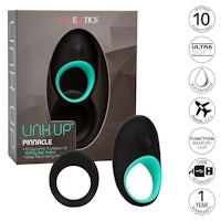 Experience a deeper, more satisfying connection for you and your partner with the powerful Link Up Remote Max. The dual stimulating ring delivers 10 functions of vigorous vibrations in a teasing textured package. An easy-touch remote control makes cycling through the orgasmic options a breeze. The erotic dual stimulating cock ring is ideal for all pleasure seekers looking to add intense vibrations to the toy box. A snug, stretchy silicone ring works to increase girth, maximize stamina and intensify pleasure with every moment. The sensually textured finish teases intimate sweet spots and will increase in intensity throughout your next steamy romp with or without the remote control. While the easy button controls the intensity and the sleek teaser gives you the stimulation you want, the integrated state-of-the-art memory chip remembers just how you like it by starting on the last function used. Take this waterproof ring for a dip and embrace powerful vibrations in the bath, shower or hot tub or use the playful remote to enjoy a range of up to 16.5 feet away! The hypoallergenic premium silicone is body safe, unscented and phthalate free to keep your most sensitive spots happy and healthy. Recharge the premium silicone massager in 2.5 hours with the provided USB charging cable to enjoy 30 minutes of high-speed stimulation or 90 minutes of low speed vibrations. Textured design to bring you to the brink of ecstasy 10 functions of vibration to maximize pleasure Easy push-button remote control scrolls forward or backwards through the functions Premium dual-density silicone Stretchy and comfortable Memory chip resumes on last function used Security travel lock - hold for three seconds to turn on or off Enhancer may be used independently of remote Waterproof enhancer may be used in or out of the water USB rechargeable (dual charging cord included) Measurements: 3.5" x 2.25" / 9 cm x 5.75 cm (Overall) <br> 1.5" / 3.75 cm (Ring Circumference)